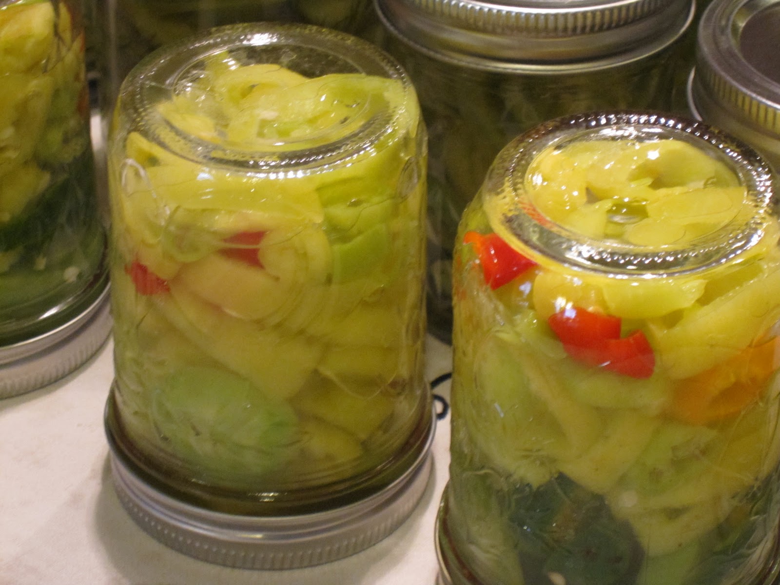 She had enough banana peppers to make about five or six jars of pepperoncini (our fave.) We just pickled these too (with no dill.)